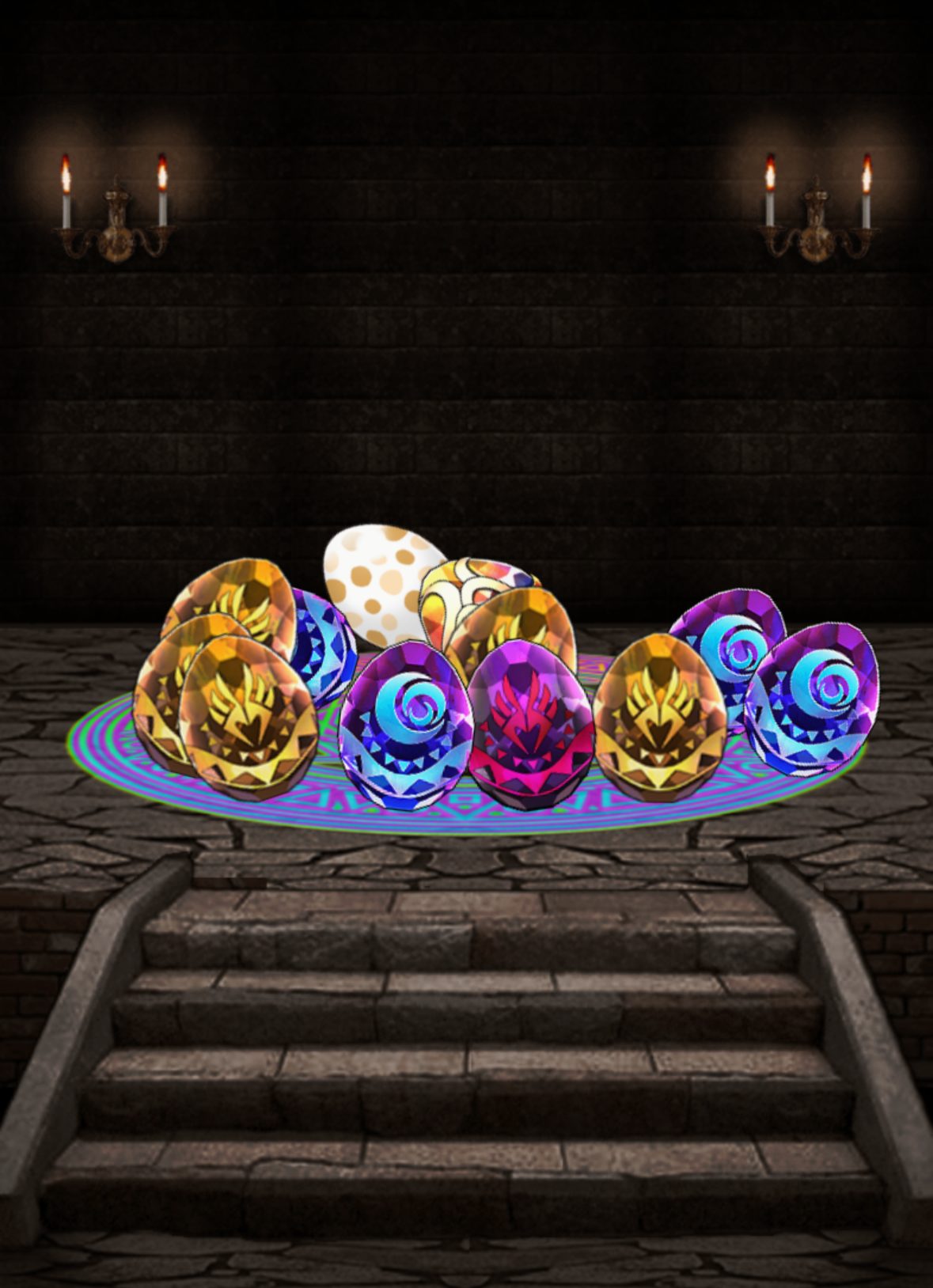 大量のドラゴンエッグ(卵)が並び、金色・虹色の卵が輝く!「どれが当たるんだろう?」と指が震える瞬間。