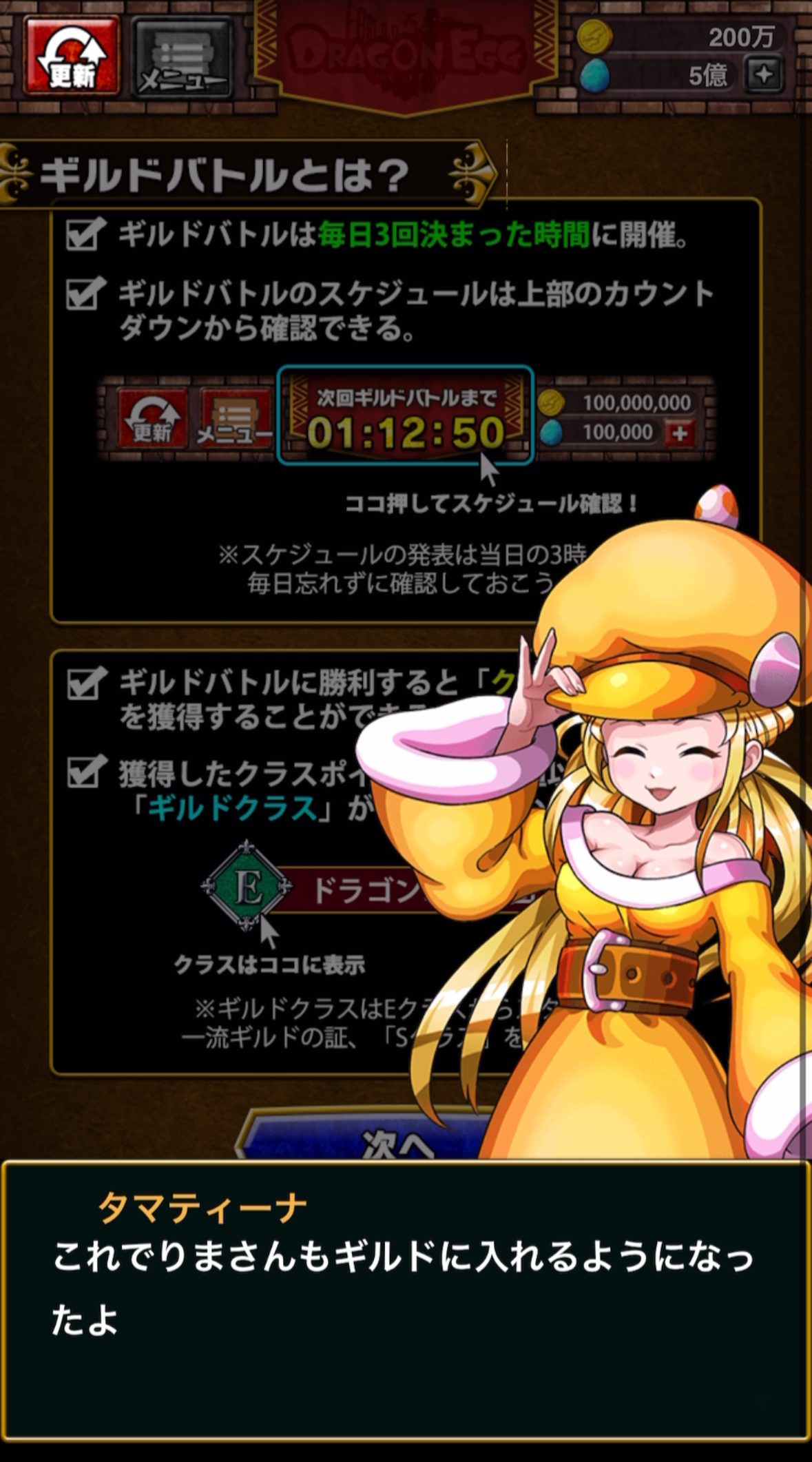 ガチャで戦力を整えたら、いざギルドへ。ドラエグのギルドバトルは毎日3回開催。